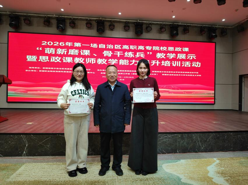 2月27日,由新疆维吾尔自治区党委教育工委、教育厅指导,新疆职业院校思想政治教育研究会主办的2026年自治区首场高职高专院校思政课“萌新磨课,骨干练兵”教学展示活动圆满落幕。我校教师表现突出,载誉而归。