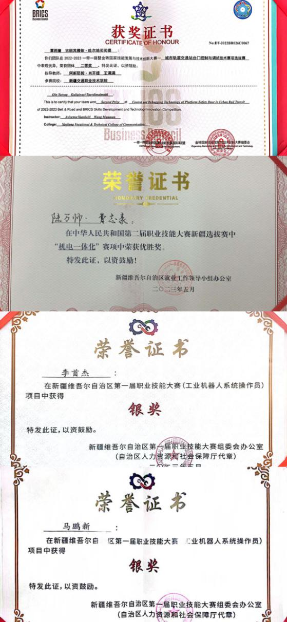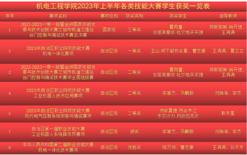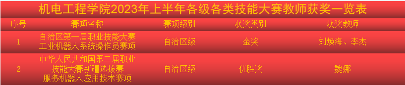 2023年机电工程学院坚持“以赛促教、学赛结合”的理念,教师和学生积极报名参加了各类技能大赛,在指导教师的科学合理安排下,参赛学生刻苦训练,积极备赛。通过师生的不懈努力下,机电工程学院在2023年上半年在各类技能大赛中荣获各项佳绩:教师共获得自治区级奖项2项,学生共获得国家级奖项1项,自治区级奖项6项。