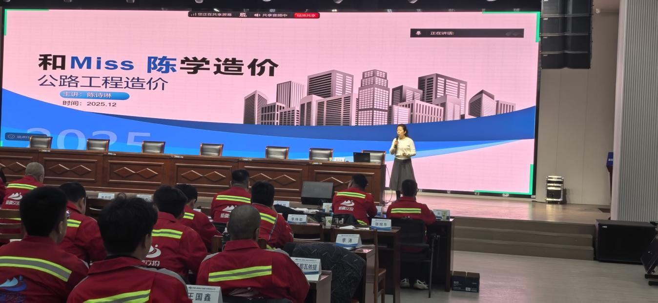 12月9日,道路桥梁工程学院教师陈诗琳受邀为新疆公路建设集团开展造价领域专题培训,围绕“干得好不如算得精,干是项目落地的基础,算是每一份投入都发挥最大价值”核心主题,为集团员工带来实操性极强的课程分享。