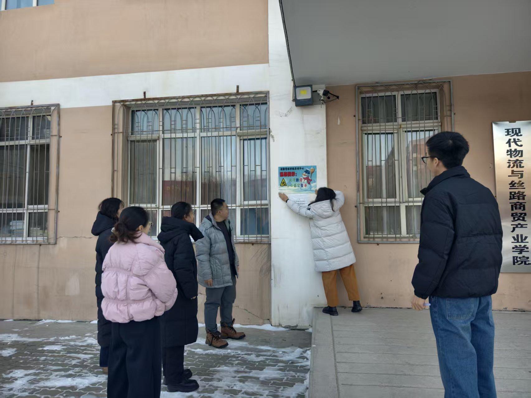 排查中,教师团队分工明确、处置专业:对建筑物屋檐、高台冰棱部位逐一细致检查;针对隐患第一时间采取措施——在重点区域张贴“天冷路滑,小心高空坠冰”警示标识,提醒师生防范;对低矮易处理的冰棱,用铁锹现场清理;对高处难清理的,立即记录备案并上报学校后勤服务中心,形成“发现-处置-闭环”管理流程,确保隐患彻底消除。